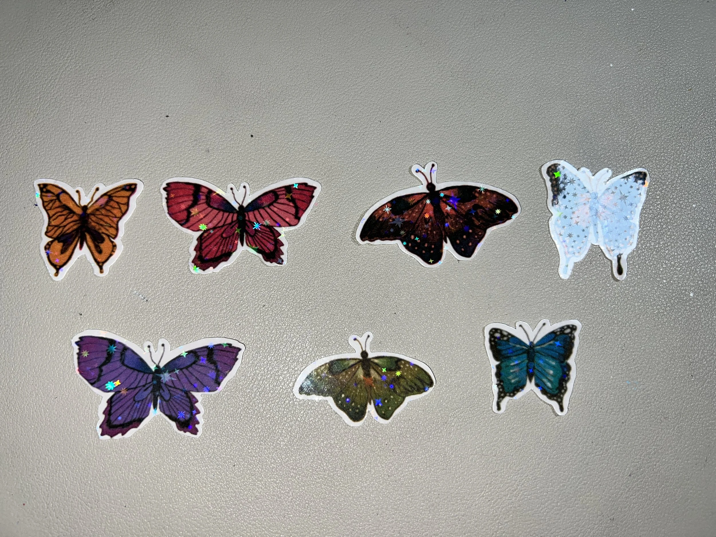 Medium Sized Butterfly die cut stickers with a holographic overlay.